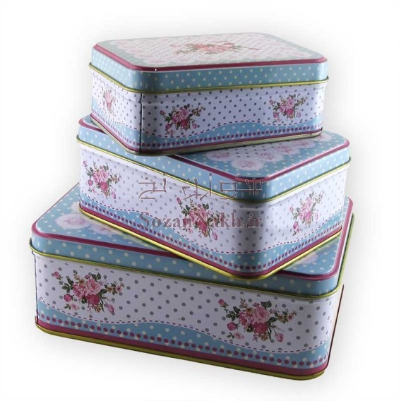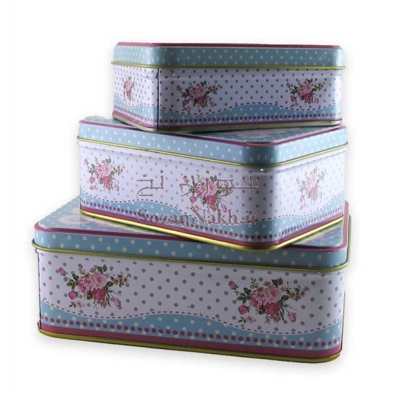 جعبه فلزی مستطیل سه تایی آبی گل صورتی _ کد 629
